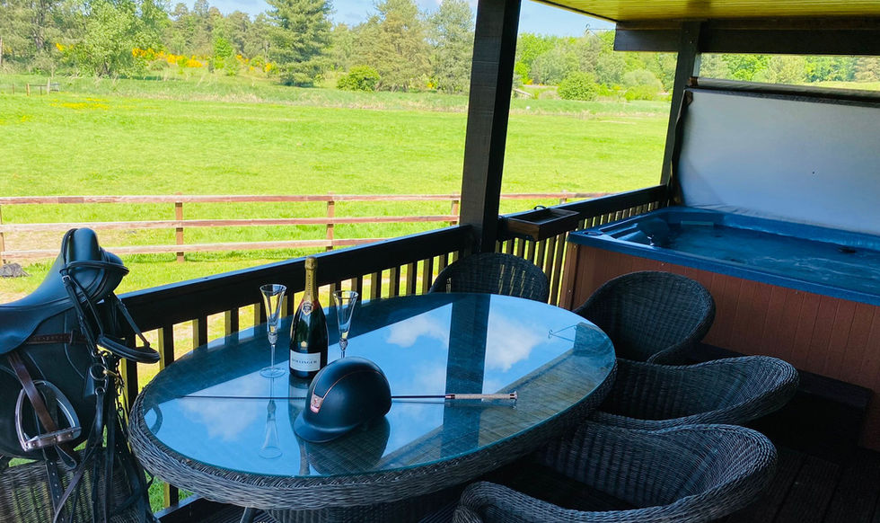 Our Executive Lodge has a hot tub on a large decking with views of the river and meadows. After a long day out hacking through the endless forest tracks just imagine unwinding in the bubbling hot tub with a glass of wine looking out across our stunning scenery.